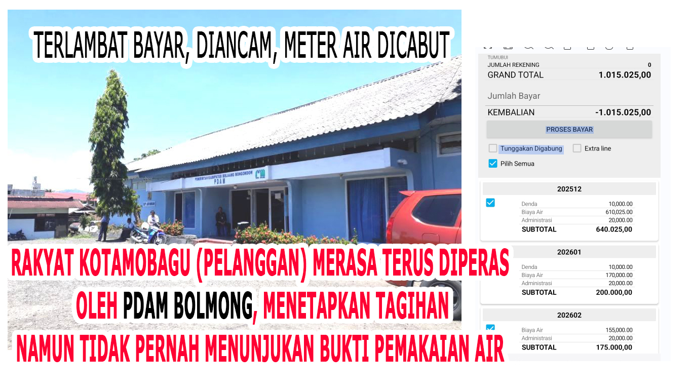 “Pihak PDAM Bolmong selalu datang ke rumah dan memberikan ancaman kepada pelanggan bahwa akan dilakukan pemutusan, sementara hak kami untuk mengetahui secara transparan mengapa tagihan air kami naik hingga jutaan, tapi tidak diberikan keterangan penggunaan jumlah kubikasi. Ini namanya pemerasan, PDAM Bolmong sudah jadi mesin yang memeras rakyat Kotamobagu yang menjadi pelanggan mereka,:” ketus sumber.