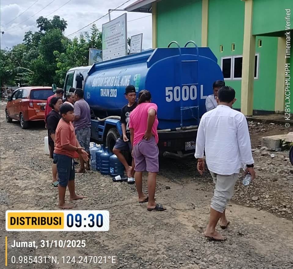 Penyaluran bantuan air bersih dengan menggunakan kendaraan tanky air milik PDAM Bolmong, hal ini untuk membantu masyarakat mendapatkan air bersih untuk air minum menyusul fasilitas sumber air mereka belum bisa digunakan.