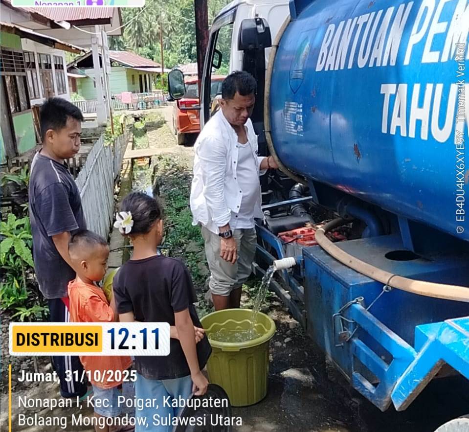Penyaluran bantuan air bersih dengan menggunakan kendaraan tanky air milik PDAM Bolmong, hal ini untuk membantu masyarakat mendapatkan air bersih untuk air minum menyusul fasilitas sumber air mereka belum bisa digunakan.